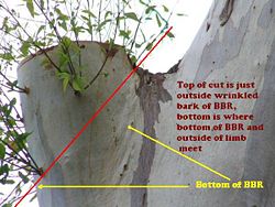 The branch collar should then be located, and can be identified by the strip of rough bark running down from the topside of the branch at its junction with the stem. The cut for removing the limb stub should be just outside the branch collar, leaving a small bump. The bump and the branch collar should not be removed since this action can reduce healing time, which could result in a major infection.