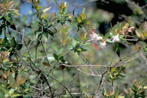 Abelias are popular garden shrubs. The most widely grown is the hybrid Abelia x grandiflora (Glossy Abelia; hybrid Abelia chinensis x Abelia uniflora). This is a rounded, spreading, multi-stemmed shrub with gracefully arching branches to 1-1.8 m tall, with ovate, glossy, dark green semi-evergreen leaves to 2-6 cm long, and clusters of white-tinged-pink, bell-shaped flowers to 2 cm long.
