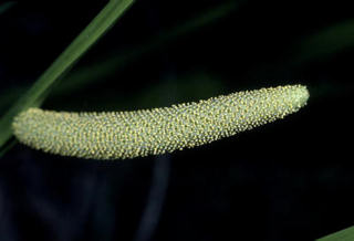 The inconspicuous flowers are arranged on a lateral spadix (a thickened, fleshy axis). Unlike aroids, there is no spathe (large bract, enclosing the spadix). The spadix is 4-10 cm long and is enclosed by the foliage. The bract can be ten times longer than the spadix. The leaves are linear with entire margin.