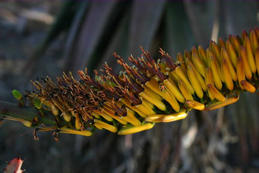 The inflorescence is a much-branched panicle with up to 30 or exceptionally 50 racemes . Flower colour ranges from yellow through orange to bright red. Flowering colour is through the winter months, as is the case with most aloes. Aloe marlothii forms natural hybrids with some 30 or more species.