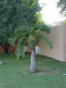 Butia,also known as a Pindo Palm is a genus of nine species of palms in the family Arecaceae, native to South America in Brazil, Paraguay, Uruguay and Argentina. It also produces an edible fruit which is also used to make alcoholic spirits. They are 'feather palms', with pinnate leaves 2-4 m long. The species vary from nearly stemless plants rarely exceeding 40 cm tall (e.g. B. campicola) to small trees up to 10 m tall (e.g. B. yatay).