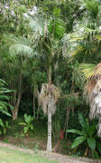 They are dioecious, with male and female flowers produced on different plants. The flowers of the male tree are 2-3 cm long and fragrant, surrounded by narrow, white bracts. The female tree produces flowers with round fruits that are also bract-surrounded. The fruits are globose, 10 to 20 cm in diameter, and have many prism-like sections, resembling the fruit of the pineapple. Typically, the fruit changes from green to bright orange or red as it matures. The fruit of some species are edible. Pandanus fruit are eaten by animals including bats, rats, crabs, elephants and monitor lizards, but the vast majority of species are dispersed primarily by water.